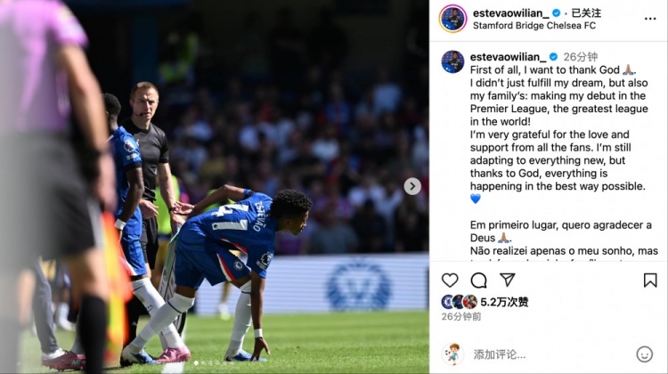 赛后,埃斯特旺更新社媒向球迷致谢,并晒照纪念自己英超首秀。